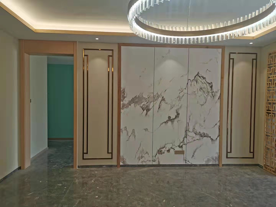 電視背景與沙發背景局部的木元素和黃銅浮雕構件,使整體空間感覺更加豐富,大而不空、厚而不重,有格調又不顯壓抑。